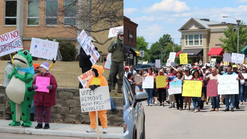 More than 100 people participated in the No Kings Rally in Phillips, Wisconsin, on Saturday, March 28, 2026. The group gathered downtown, holding signs, chanting, and waving to drivers passing by on North Lake Avenue, in front of the Price County Court House.