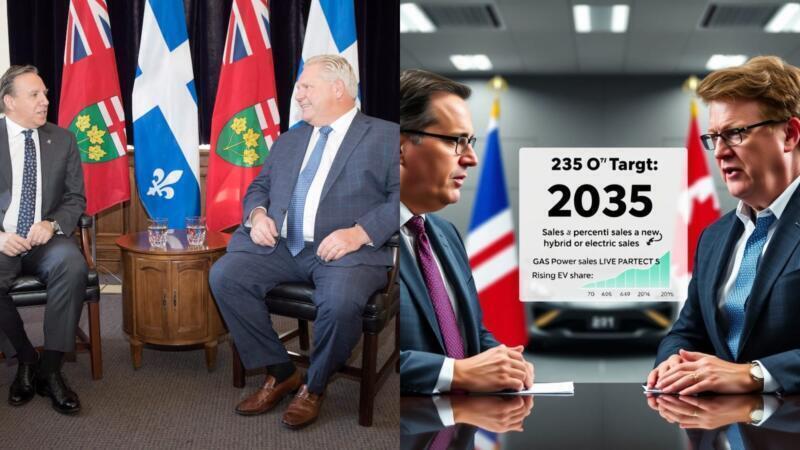 Legault minimiza críticas de Ford ao mandato elétrico de Quebec; metas foram ajustadas diante de tarifas dos EUA e políticas EV da administração Trump.
